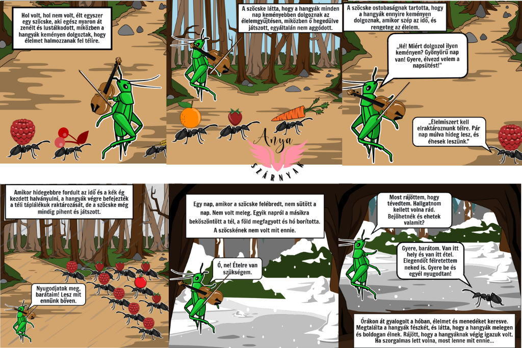 Ezópus meséje: A klasszikus mese a hegedülő tücsökről (szöcske), aki nyáron nem dolgozik, és télen éhen marad, míg a szorgalmas hangya élvezi a munkája gyümölcsét.